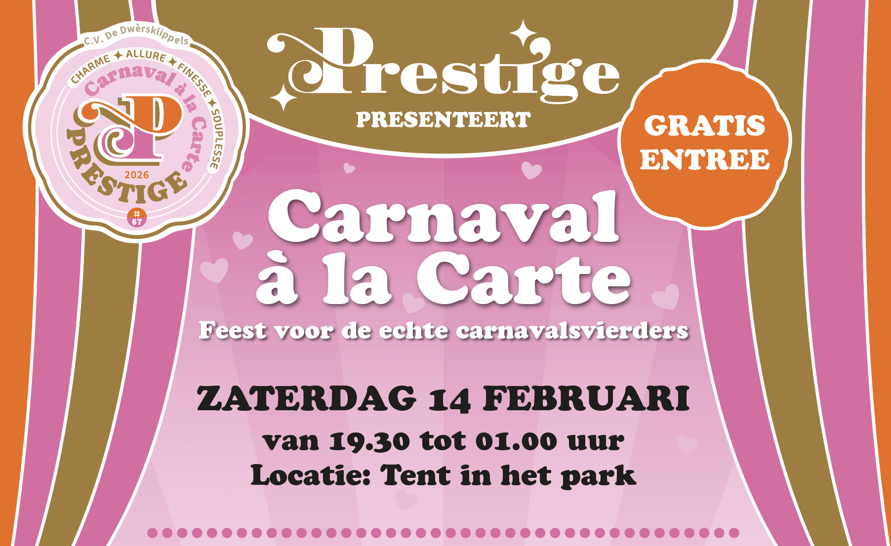 Na de carnavalsmis hoef je maar een paar meter te lopen en je stapt zó in onze prachtige tent in het Park. Hier kun je onder het genot van een drankje lekker uit je bol gaan op deze zaterdagavond. Carnaval à la Carte vieren in het Park, midden in ons gezellige dorp. Zo hoort het te zijn! Met optredens van onze Jeugdgarde, Prinsengarde en diverse blaaskapellen: Leuk Da Ge D’r Band, Koekwouzenband, ZsaZsaZsoe, Eenoodje, BlueBand en de Blaospoepers.